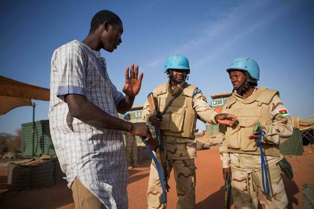 Ce matin, les soldats de la paix burkinabé se préparent à s’acquitter de leurs tâches quotidiennes de protection des civils et du personnel, des installations et du matériel des Nations Unies à Tombouctou, dans le nord du Mali.