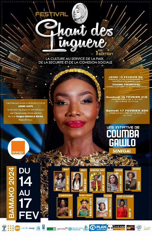 Thème principal : « La Culture au service de la paix, de la sécurité et de la cohésion sociale ». Bamako, la capitale du Mali, accueille du mercredi 14 au samedi 17 février 2024, une édition du Festival international Chant des Linguère, initié par Coumba Gawlo, artiste chanteuse sénégalaise, Présidente Directrice Générale de de la structure de communication, d’événementiel et de formation Gawlo Office Média (Go Media) et Présidente de l’association à vocation sociale et humanitaire Lumière pour l’Enfance Coumba-Gawlo (LPE-CG).