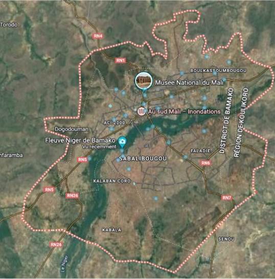 Composé de 6 communes et 66 quartiers, situés en plein cœur de la zone sahélienne d’Afrique de l’Ouest, le district de Bamako, capital du Mali sur 375 km2 dans la cuvette du fleuve Niger, le relief est assez marqué, alternant une zone de plateaux relativement monotone aux alentours du fleuve et des collines entourant la ville.