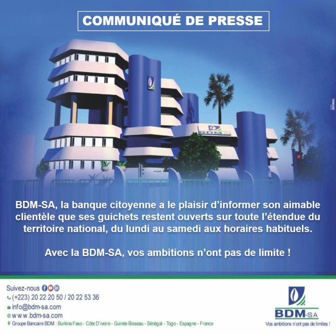 BDM-SA, la banque citoyenne a le plaisir d’informer son aimable clientèle que ses guichets restent ouverts sur toute l’étendue du territoire national, du lundi au samedi aux horaires habituels.