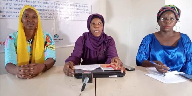 Mme Coulibaly Mariam Camara, Trésorière de l’Association DONKOSIRA, accompagnée de Mme Assa Waly Diakité, Assistante à DONKOSIRA et Mme Aïssata Goro, comptable à DONKOSIRA, a rappelé qu’il y a 28 ans que la journée du 16 avril a été initiée pour dénoncer l’esclavage et le travail des enfants dans le monde. Selon elle, l’objectif de cette journée internationale est d’éradiquer toutes les formes contemporaines d’esclavage impliquant des enfants telles la traite d’êtres humains, l’exploitation sexuelle, le travail des enfants, les mariages forcés et recrutement forcé d’enfants dans les conflits armés. « La journée mondiale de lutte contre l’esclavage des enfants a été initiée pour sensibiliser le public à ces problèmes et encourager les gouvernements, les organisations internationales et la société civile à travailler ensemble pour éradiquer ces pratiques », a indiqué Mme Coulibaly Mariam Camara.