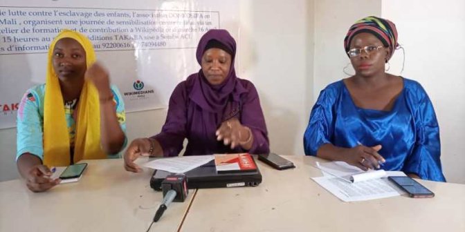 Chaque année, le 16 avril, la communauté internationale célèbre la journée internationale de lutte contre l’esclavage des enfants. Au Mali, le 16 avril 2023, n’est pas passé inaperçu. L’Association DONKOSIRA ou le « chemin de la connaissance », en partenariat avec Wikimédia Mali, a décidé de marqué cette journée d’une pierre blanche. Dans les locaux des Editions Takaba, elle a organisé une journée de sensibilisation sur le fléau de l’esclavage, à travers une conférence de presse, suivi d’un atelier de formation et de contribution à Wikipédia.