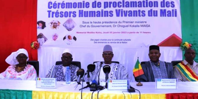 Le Mali a 6 nouveaux Trésors humains vivants (THV) depuis le 4 janvier 2023. Par décret n°2023-0001/PT-RM du 4 janvier 2023, le Colonel Assimi Goïta, Président de la Transition, Chef de l’Etat, a proclamé 6 Trésors humains vivants. Ce sont : Mouhamedou Ould Cheikh Hamahoullah HAIDARA dit Bouyé, autorité morale, médiateur social, Nioro du Sahel ; Lassana Sidy MOULEÏKAFOU, tradithérapeute, Bamako ; Anna KODIO, tradithérapeute, Commune rurale de Barapireli, Koro ; Mamadou Babou NIANG, tradithérapeute, Magicien, Bamako ; Cheick Malifalifou Yiriba DIARRA, tradithérapeute, Historien-traditionniste du Manden, Kati ; et DIAKITE Hadja Youma Aïssata KEBE, Médiatrice socioculturelle, Bamako.