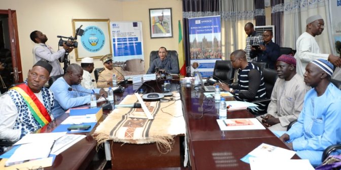 Présidée par Hamane Demba Cissé, secrétaire général du Ministère en charge de la culture, la rencontre a enregistré la participation du Représentant du Ministre de la Réconciliation, de la Paix et de Cohésion nationale ; le Gouverneur de la Région de Bandiagara ; le Représentant et Chef du Bureau de l’UNESCO au Mali, représenté ici par Fidèle Guirou, Coordinateur de projet ? Bureau de l’UNESCO au Mali ; les Maires des Communes de Bandiagara, Sangha, Doucombo et Bankass. Il faut aussi annoncé la participation en ligne des partenaires Techniques et Financiers, depuis le Siège de l’UNESCO à Paris, pour Mme Krista PIKKAT, Directrice Culture et Situations d’Urgences et depuis le siège de l’Alliance Internationale pour la Protection du Patrimoine dans les zones en conflit (ALIPH) à Genève, Valery FRELAND, Directeur Exécutif de la Fondation ALIPH.