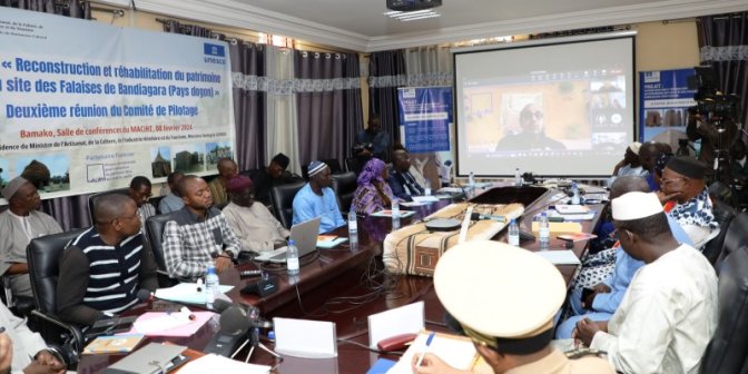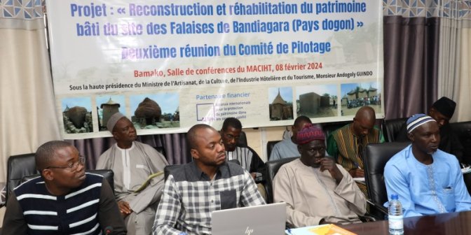 Le jeudi 8 février 2024, la salle de conférence du Ministère de l’Artisanat, de la culture, de l’industrie Hôtelière et du Tourisme a abrité la 2e réunion du Comité de pilotage du Projet « Reconstruction et réhabilitation du patrimoine bâti du site des Falaises de Bandiagara (Pays-dogon) ».