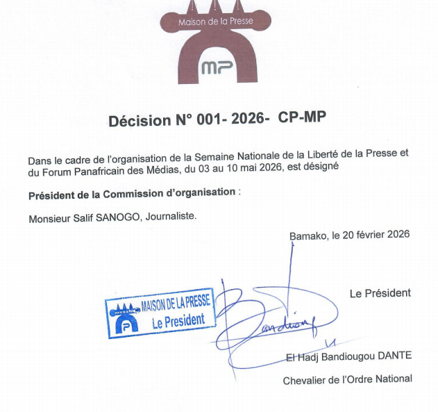 Le journaliste Salif Sanago, ancien Directeur Général de l’ORTM et présentement Directeur Général de la télévision de l’AES, a été désigné le 20 février 2026, par Bandiougou Danté, président du Comité de pilotage de la Maison de la presse du Mali, pour présidé la Commission qui sera chargé de l’organisation avec succès de la Semaine Nationale de la Liberté de la Presse 2026 et du Forum Panafricain des Médias, que notre pays va abriter du 03 au 10 mai 2026.