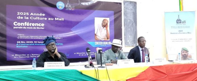 La cérémonie a été présidée par le directeur national de l’Action culturelle et non moins coordinateur du projet Culture Mali 2025, Alamouta Danioko, représentant le ministre Mamou Daffé. Outre, le parrain du mois de février, l’icône du design, Cheick Diallo, la conférence a enregistré la présence du représentant du recteur de l’Université Kurukan fuga de Bamako (UKB), en occurrence le doyen de la Fsap, Pr Cheick Hamalla Touré.
