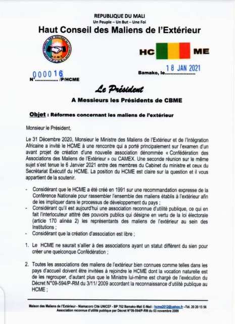 Actualités > CONFEDERATION DES ASSOCIATIONS DES MALIENS DE...
