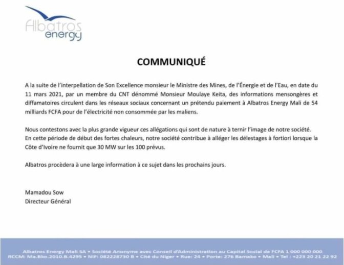 « A la suite de l’interpellation de Son Excellence Monsieur le Ministre des Mines, de l’Énergie et de l’Eau, en date du 11 mars 2021, par un membre du CNT dénommé Monsieur Moulaye keita, des informations mensongères et diffamatoires circulent dans les réseaux sociaux concernant un prétendu paiement à Albatros Energy Mali de 54 milliards de FCFA pour de l’électricité non consommée par les maliens », indique le communiqué de Albatros Energy.