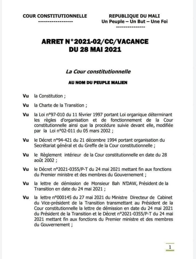 Dans son arrêt n°2021-02/CC/Vacance du 28 mai 2021, la Cour Constitutionnelle du Mali a constaté « la vacance de la Présidence de la Transition suite à la démission de Monsieur Bah NDAW, Président de la Transition, Chef de l‘Etat ». Elle a dit que « le Vice-président de la Transition exerce les fonctions, attributs et prérogatives de Président de la Transition pour conduire le processus de transition à son terme ». Mieux, elle a précisé qu’ « à compter de la notification du présent arrêt, le Vice- président de la Transition porte le titre de Président de la Transition, Chef de l’Etat ». Et, a ordonné « la notification du présent arrêt au Vice-président de la Transition, au Président du Conseil National de Transition et sa publication au Journal officiel ». Lisez l’intégralité de l’arrêt !