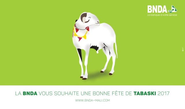 La BNDA vous souhaite une bonne fête de TABASKI 2017Dans le cadre de la fête de TABASKI 2017, la banque citoyenne BNDA souhaite une bonne fête aux maliens et toute sa clientèle.