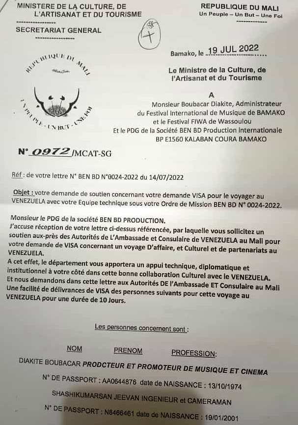 On se souvient que le 25 juillet 2022, le Ministère de l’Artisanat, de la Culture, de l’Industrie Hôtelière et du Tourisme, a saisi Mme la Commissaire du 14e Arrondissement du District de Bamako, d’une plainte contre X pour faux et usage de faux. Dans la plainte signée par Hamane Demba Cissé, secrétaire général du Ministère de l’Artisanat, de la Culture, de l’Industrie Hôtelière et du Tourisme, « dans la journée du 25 juillet 2022 aux environs de 11 heures 40 minutes, le Département a été saisi par l’Ambassade du Venezuela qui se trouvait en possession d’un document suspect ». La plainte précise qu’ « après vérification, il a été donné de constater que X avait tenté d’imiter la signature de Monsieur le ministre aux fins d’une obtention frauduleuse de visas permettant à une dizaine d’individus de voyager sur le Venezuela ».