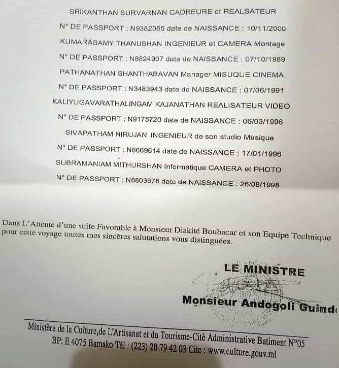 Il faut dire que cette lettre est tellement truffée de fautes que l’Ambassade du Venezuela a soupçonné un faux coup. Elle a décidé de se rassurer auprès du Cabinet du département en charge de la Culture. Et, malheureusement ses soupçons se sont confirmés. Andogoly Guindo, Ministre de l’Artisanat, de la Culture, de l’Industrie Hôtelière et du Tourisme du Mali, n’ a jamais écrit une lettre adressée à Boubacar Diakité, pour le soutenir dans aucune procédure d’obtention de VISA à l’Ambassade du Venezuela au Mali. Dans tous les cas, le Ministère de l’Artisanat, de la Culture, de l’Industrie Hôtelière et du Tourisme, par la voix du Colonel Sibiry Konaté, Haut Fonctionnaire de défense du Ministère de l’Artisanat, de la Culture, de l’Industrie Hôtelière et du Tourisme, a indiqué que son département a décidé de poursuivre cette affaire afin que toute la lumière soit faite et que des sanctions appropriées soient prises contre les mis en cause que sont Boubacar Diakité et huit ou neuf autres individus qui seraient de nationalité sri-lankaise.