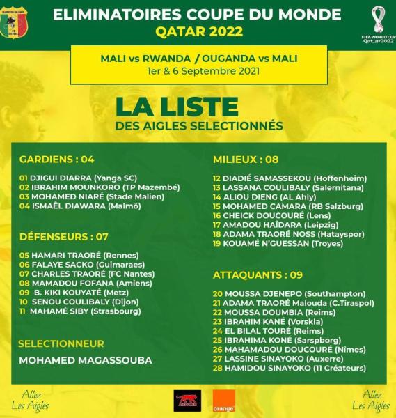 Le jeudi 26 août 2021, dans l”après-midi au siège de la Fédération Malienne de football, le sélectionneur national Mohamed Magassouba a dévoilé une liste de 28 joueurs pour la première et deuxième journées des éliminatoires de la Coupe du Monde Qatar 2022.