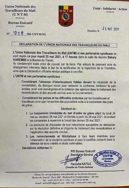 L’Union Nationale des Travailleurs du Mali (UNTM) et ses partenaires syndicaux se sont réunis le mardi 25 mai 2021. Ils ont décidé de la suspension immédiate du mot d’ordre de grève allant du lundi 24 mai au vendredi 28 mai 2021 et illimitée à partir du 28 mai 2021. Ils ont invité les camarades à reprendre le travail dès demain 26 mai 2021. Lisez l’intégralité de la déclaration !