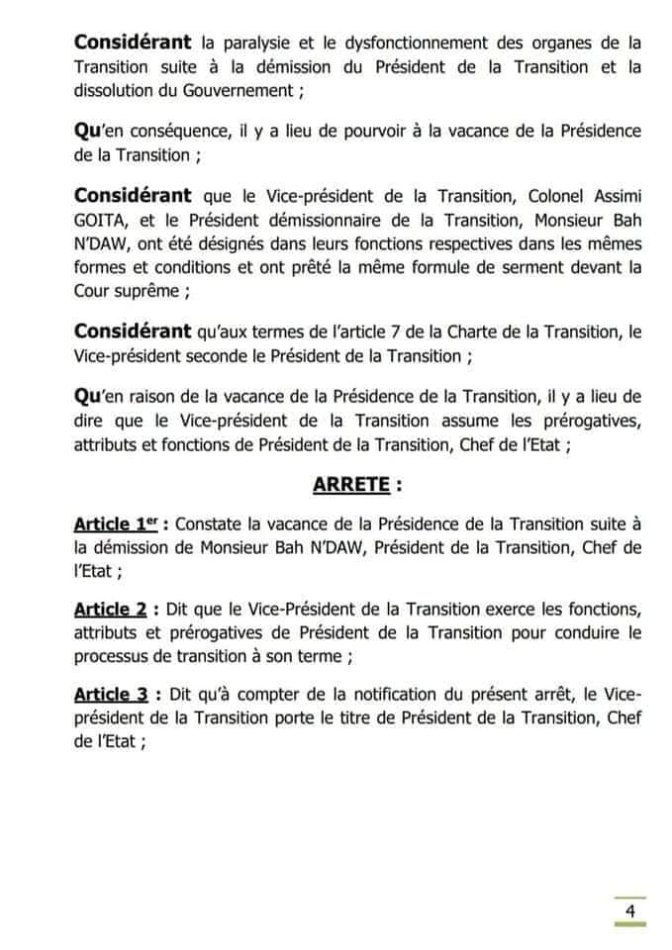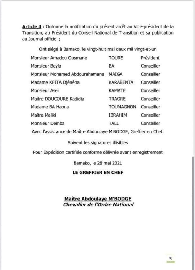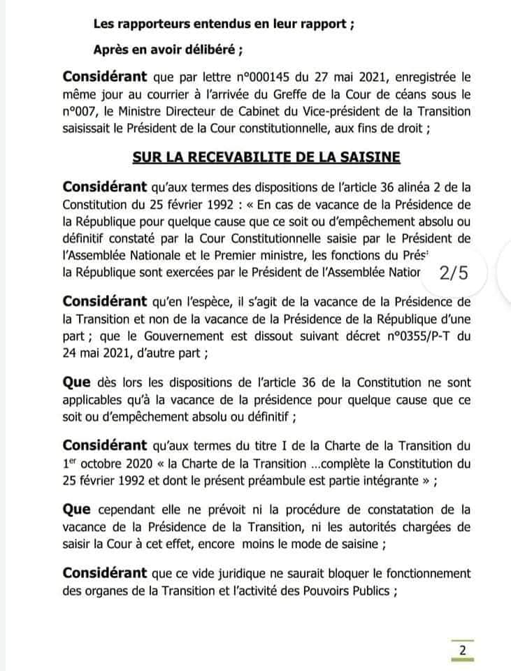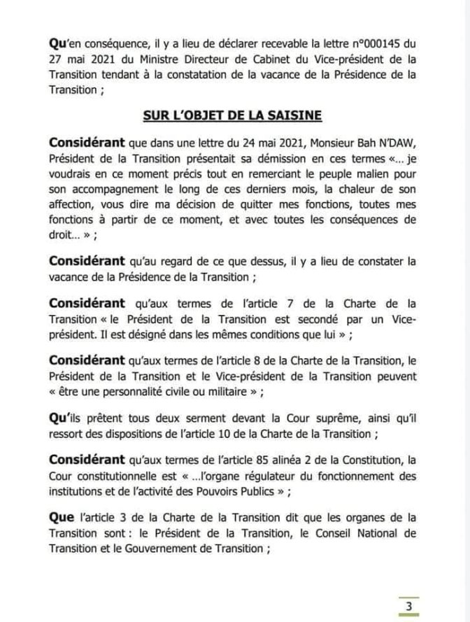 Dans son arrêt n°2021-02/CC/Vacance du 28 mai 2021, la Cour Constitutionnelle du Mali a constaté « la vacance de la Présidence de la Transition suite à la démission de Monsieur Bah NDAW, Président de la Transition, Chef de l‘Etat ». Elle a dit que « le Vice-président de la Transition exerce les fonctions, attributs et prérogatives de Président de la Transition pour conduire le processus de transition à son terme ». Mieux, elle a précisé qu’ « à compter de la notification du présent arrêt, le Vice- président de la Transition porte le titre de Président de la Transition, Chef de l’Etat ». Et, a ordonné « la notification du présent arrêt au Vice-président de la Transition, au Président du Conseil National de Transition et sa publication au Journal officiel ». Lisez l’intégralité de l’arrêt !