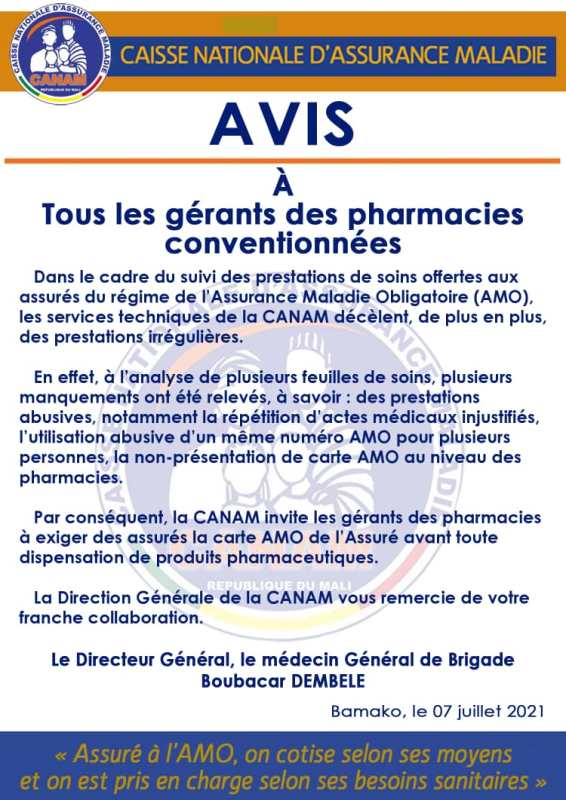 Par conséquent, la CANAM invite les gérants des pharmacies à exiger des assurés la carte AMO de l’Assuré avant toute dispensation de produits pharmaceutiques.
