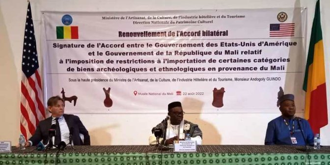« Protégeons nos biens culturels pour les générations futures », est le thème d’une exposition que le Musée national du Mali abrite du 22 août au 30 septembre 2022. Le vernissage de cette exposition a enregistré le 22 août 2022, la signature du renouvellement pour la 7e fois depuis 1993, de l’accord sur les restrictions à l’importation de matériels archéologiques de la vallée du Niger et des Falaises de Bandiagara, entre la République du Mali et les États-Unis d’Amérique.